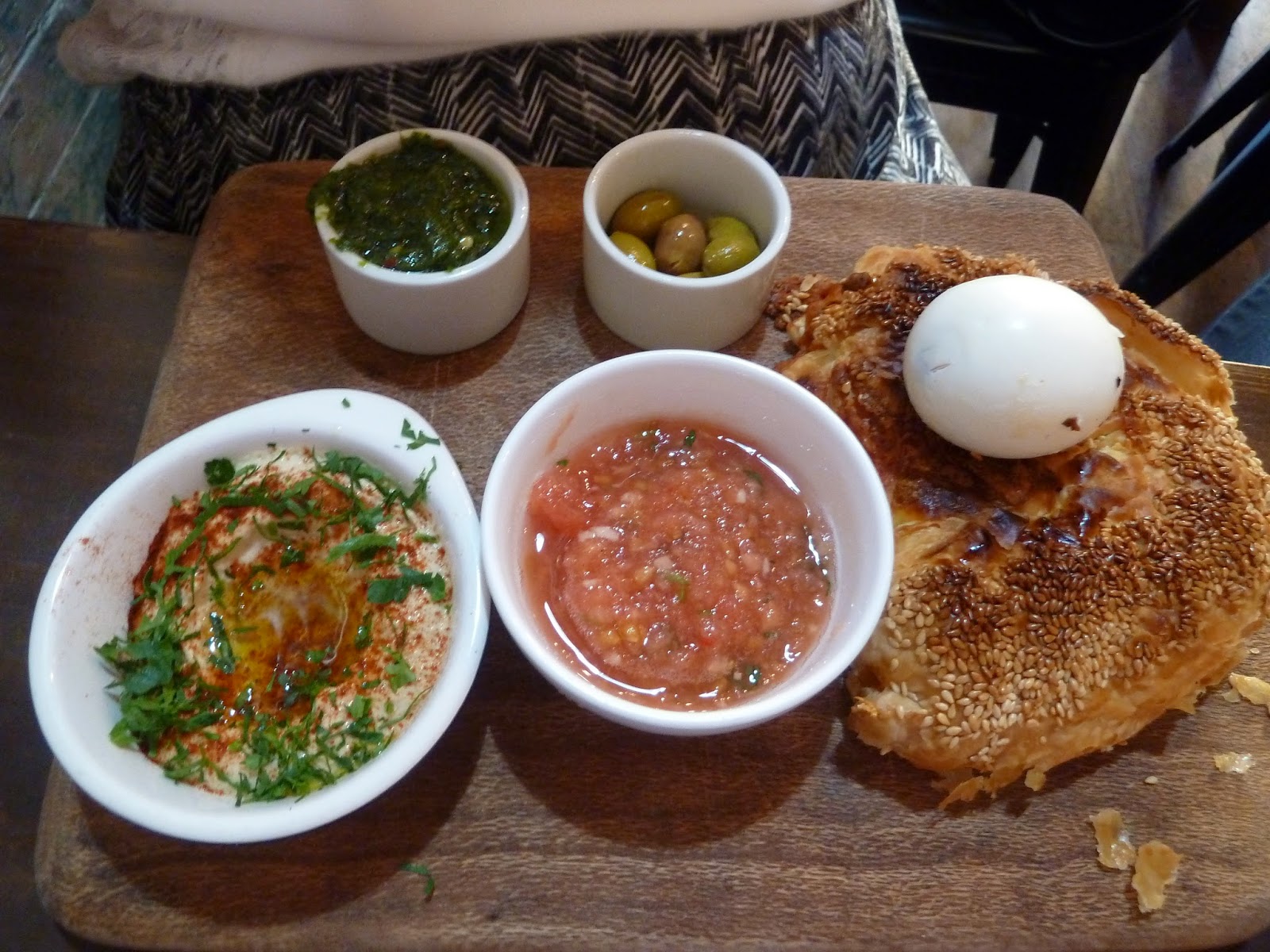 Ziva - a baked filo pastry filled with cheese and olives, a boiled egg, hummus, grated tomato, and spicy coriander. CM loved the pastry and commented on the delicious flavours of the cheese with the olives. The hummus went down a treat too.